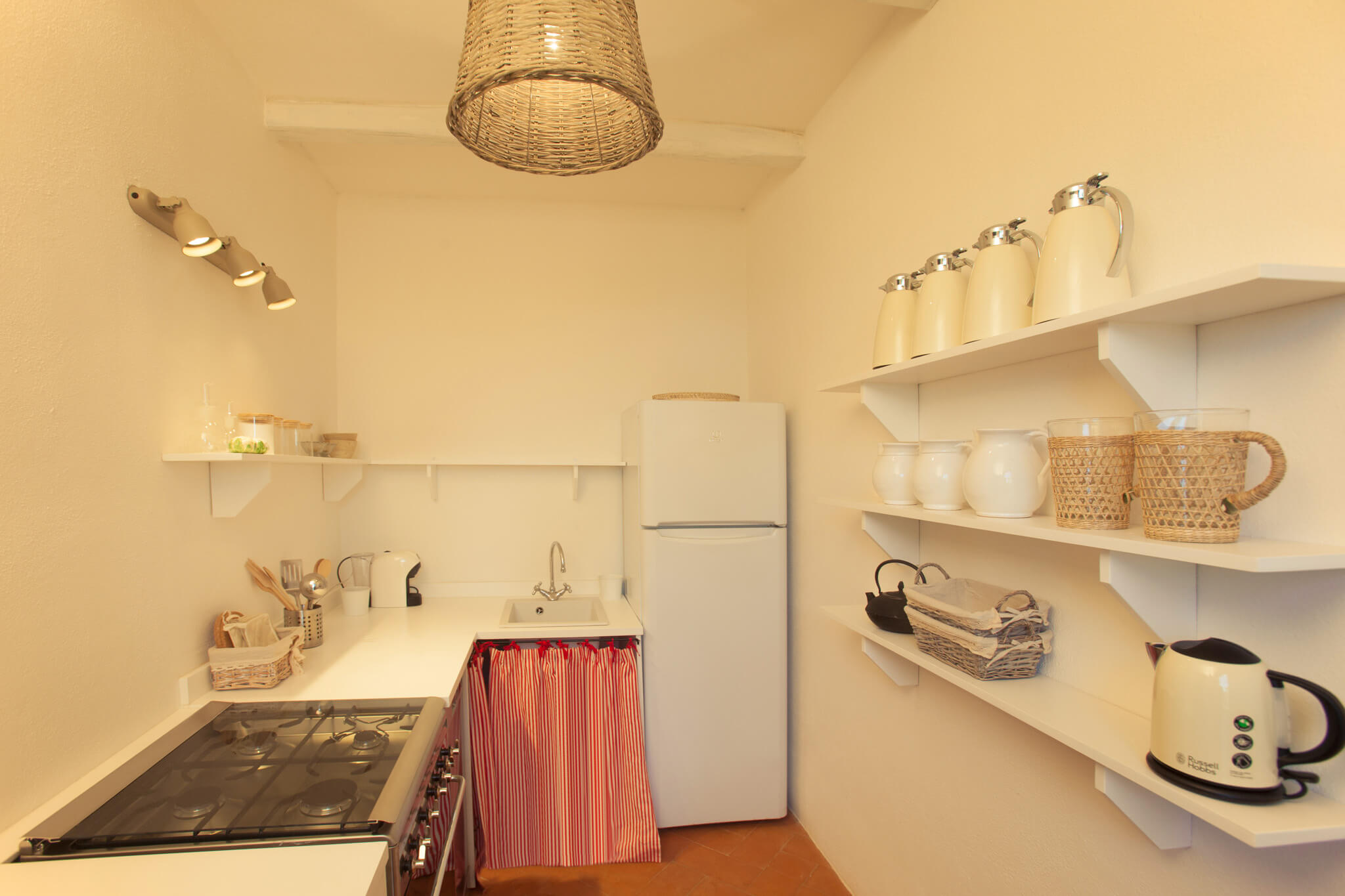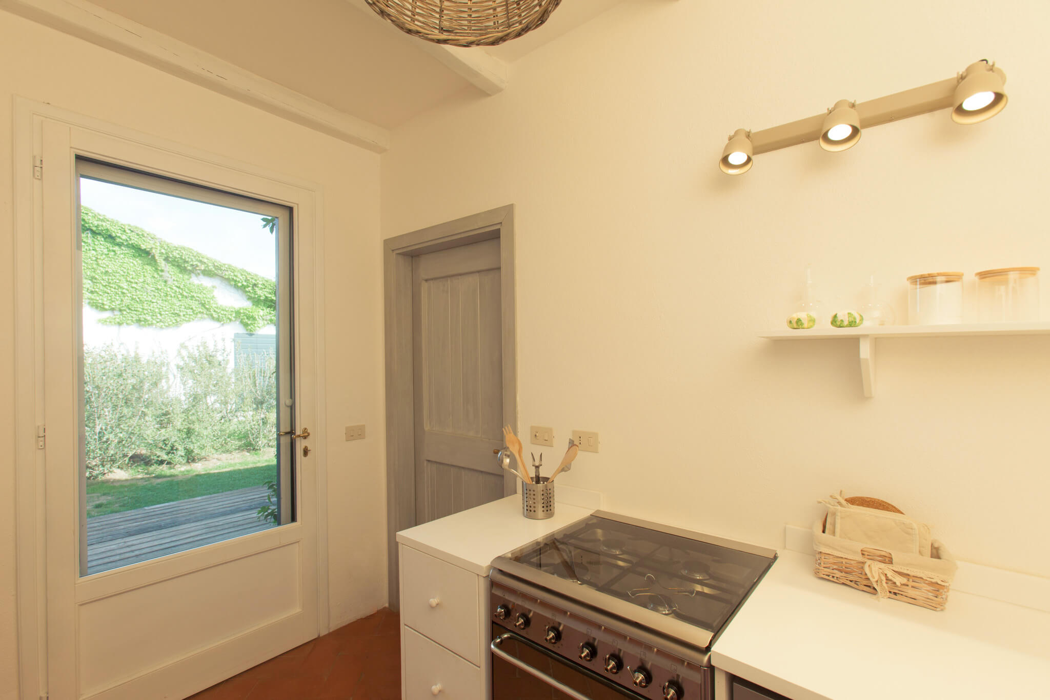 Il Piccolo Cottage del Lupino si sviluppa attorno alla zona giorno della casa. Una sala da pranzo con camino e morbidi divani bianchi accolgono gli ospiti che entrano dal patio o dal giardino. La cucina, compatta e funzionalissima, è anch’essa tutta bianca. In cucina non mancano il forno e la lavastoviglie e tutto ciò che serve per preparare piatti meravigliosi. Vicino alla cucina c’è anche una piccola lavanderia. La zona notte, climatizzata, è composta da tre camere: due matrimoniali ed una doppia. Due ampi bagni bianchi completano la casa.